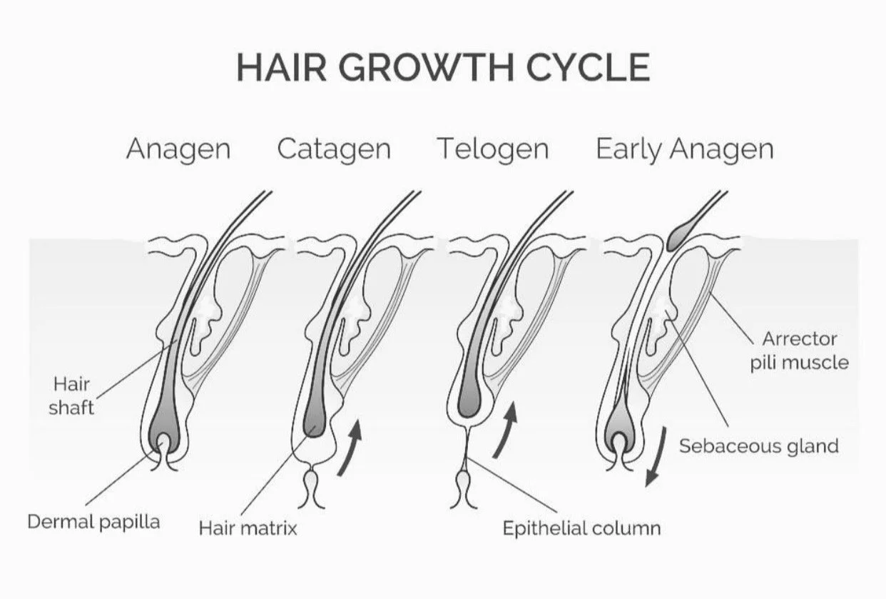 There are 3 Phases of growth in each “group” of hair that complete a growth cycle. Anagen, Catagen, & Telogen. Once all 3 phases are completed, then the cycle will repeat with a new anagen phase of growth.